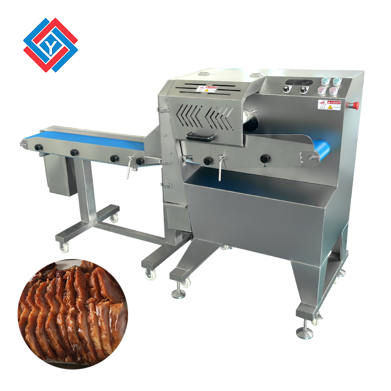 切熟肉片機產品應用:通過輸送帶送料專門切割無骨熟肉、鹵肉等食材,可以快速進行切片、切斷。