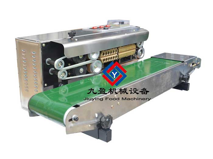 3、當裝有物品的包裝放置在輸送帶上,袋的封口部份被自動送入運轉中的兩根封口帶并帶入加熱區,加熱塊的熱量通過封口帶傳輸到袋的封口部份,使薄膜受熱熔軟,再通過冷卻區,使薄膜表面溫度適當下降,然后經過滾花輪(或印字輪)滾壓,使封口部份上下塑料薄膜粘合并壓制出網狀花紋(或印制標志),再由導向橡膠帶與輸送帶將封好的包裝袋送出機外,完成封口作業